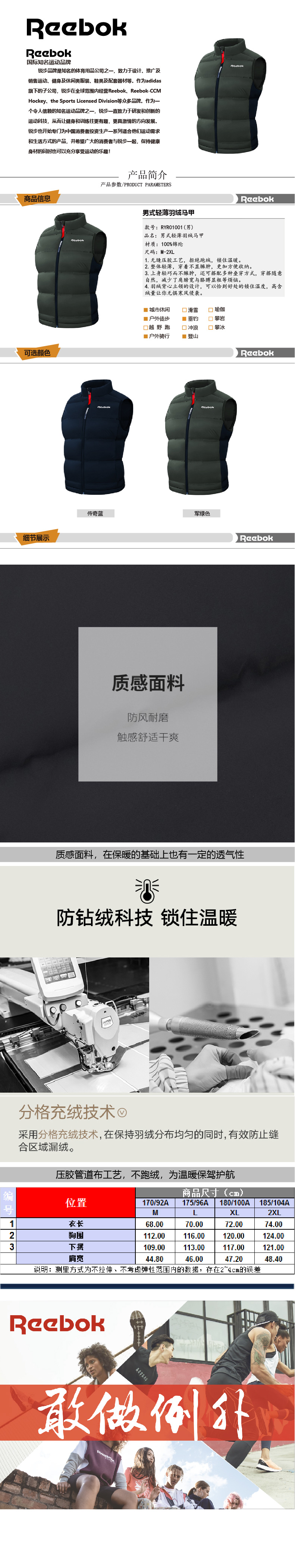 锐步(Reebok)|运动装,-锐步(Reebok) 男式轻薄羽绒马甲